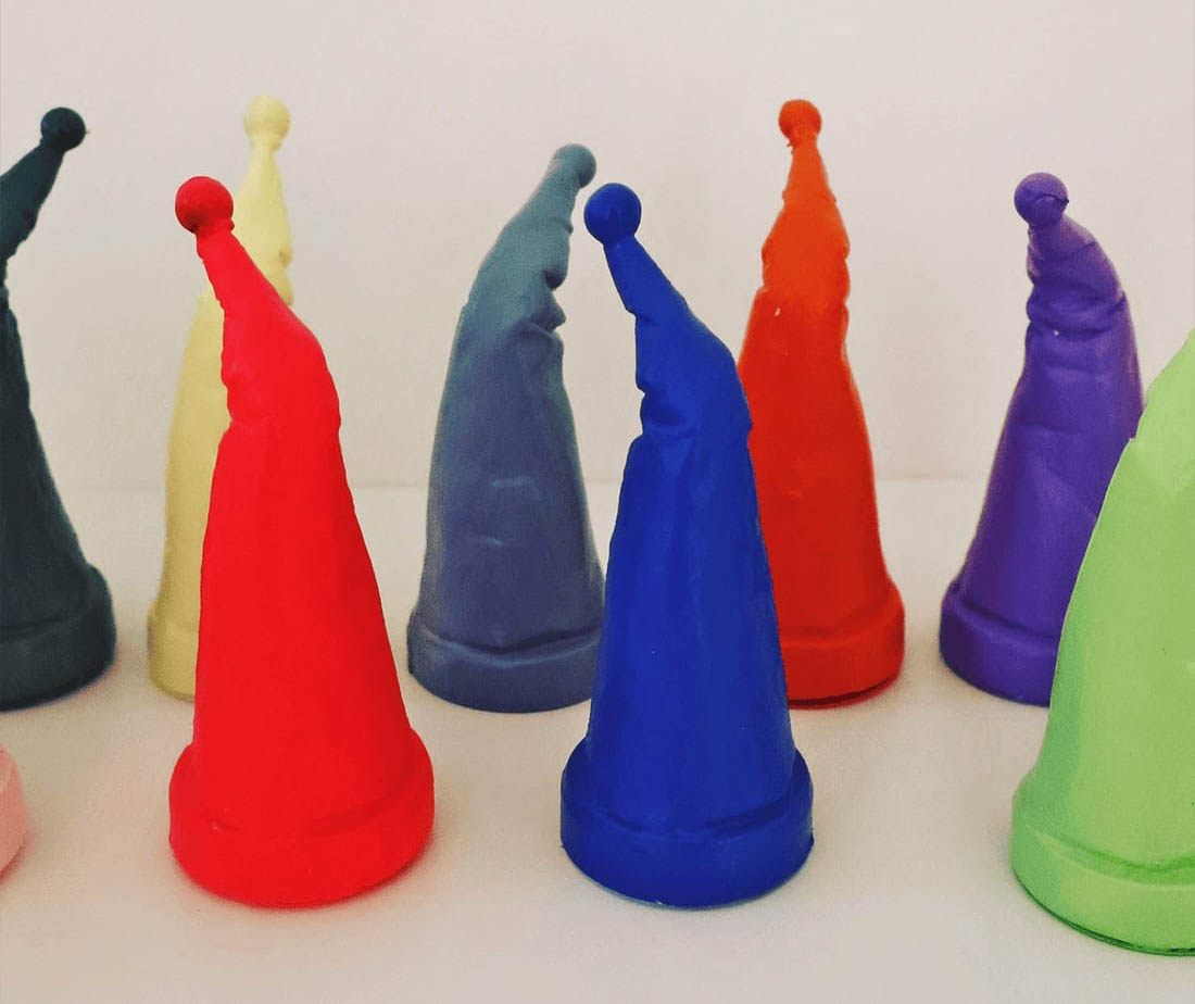 Sie forschte und plante: Wie sehen Zwerge aus? Wie sind sie? Nun, kreativ, liebenswürdig, sozial und hilfsbereit! Typisch ist die Zipfelmütze. Julia Timmer fand nach Wochen zahlreicher Materialstudien und Experimente eine fröhliche freundliche Form- und Farbsprache. Dann folgte der lange intensive künstlerische Prozess der Fertigung. Denn: Der Zeit- und Aufbauaufwand waren hoch!